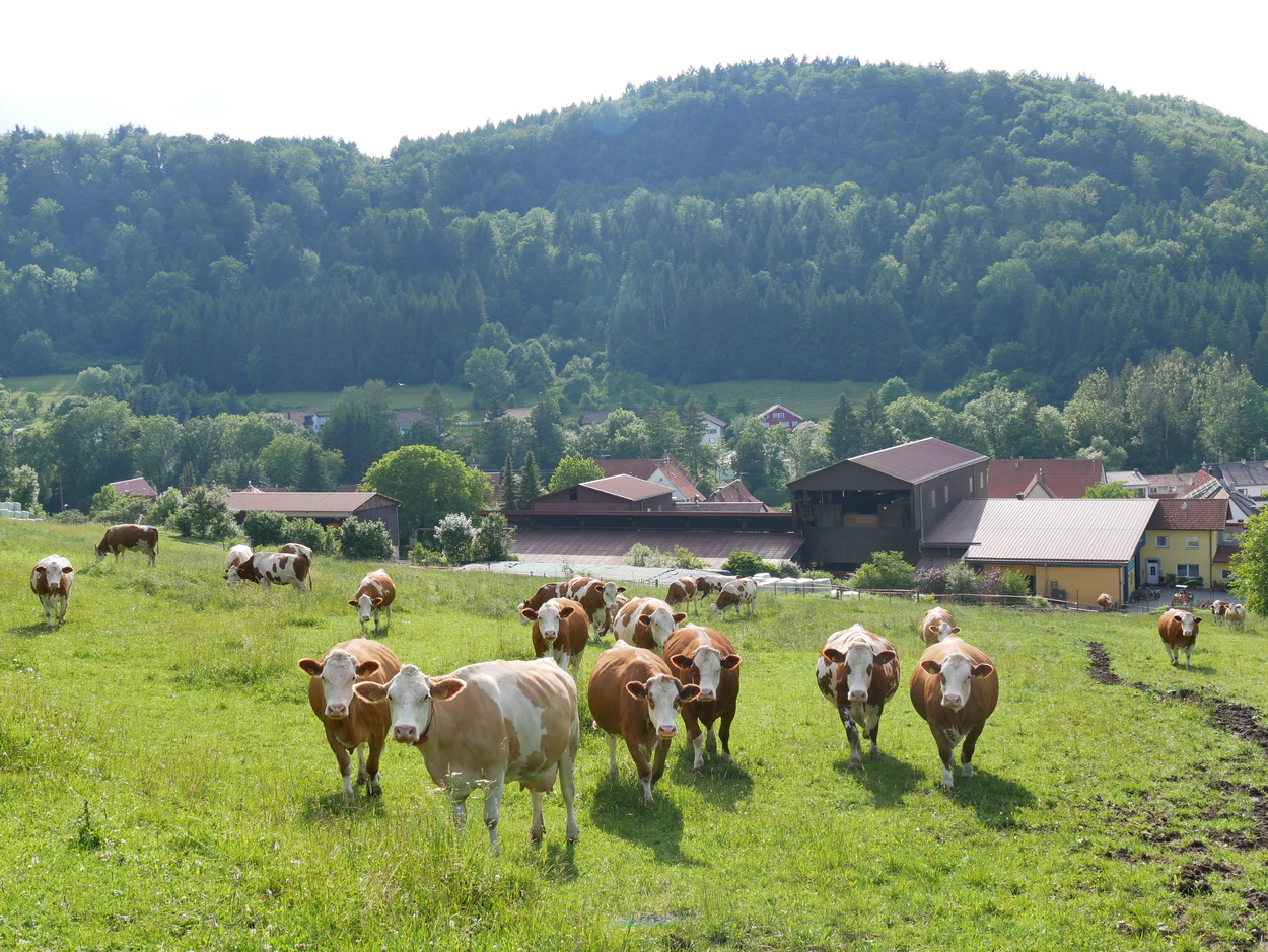 Wir sind ein Bioland-Milchviehbetrieb mit Kälberaufzucht, Grünland, Futter- und Ackerbau.Unsere Kühe können sich im Offenlaufstall frei bewegen, im Sommer selbständig auf die Weide gehen und werden von einem Melkroboter gemolken.