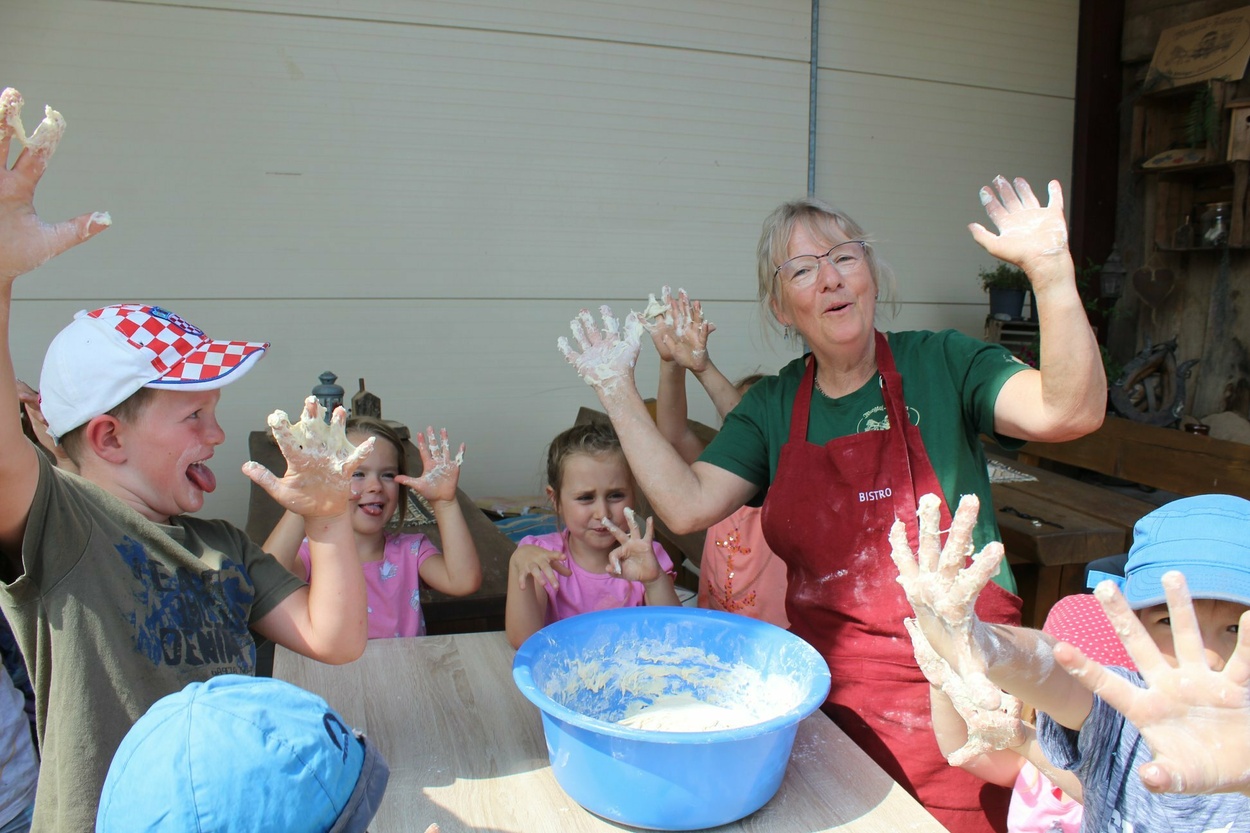 | Verköstigung (landwirtschaftlich erzeugt, regional) | ja: Eier, Ziegenmilch, vom Korn zum Brot, Gemüsen aus dem Bauerngarten, Obst, Kürbisse, Kartoffeln |